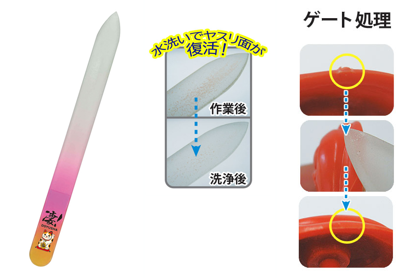 ナノガラスを使用した両面ヤスリになっており、プラモデルのゲート処理を綺麗に仕上げます。
